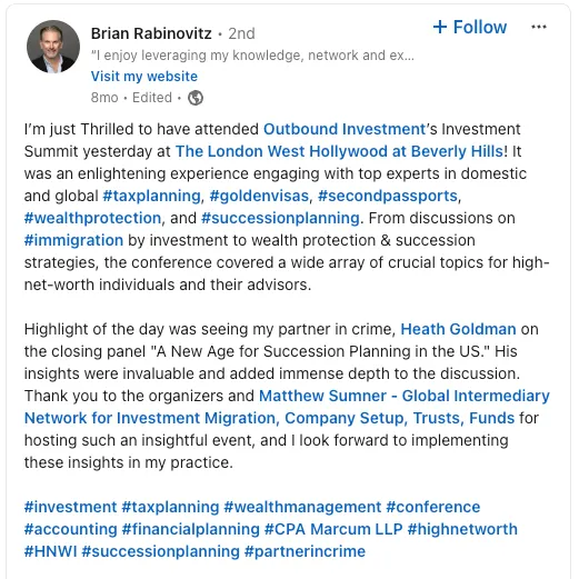 Join us on April 1st in New York City for the Outbound Investment Summit, an exclusive gathering designed for professionals across various industries, including finance, immigration, wealth management, consulting, legal, real estate, and more. This summit offers a unique opportunity to: